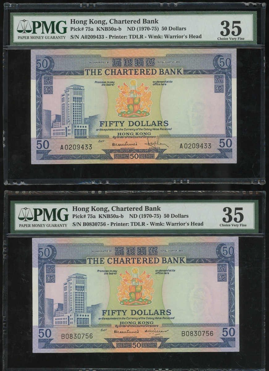 The Chartered Bank, a pair of $50, ND(1970-75), serial number A0209433 and B0830756, (Pick 75a), both PMG 35 choice very fine.(2)