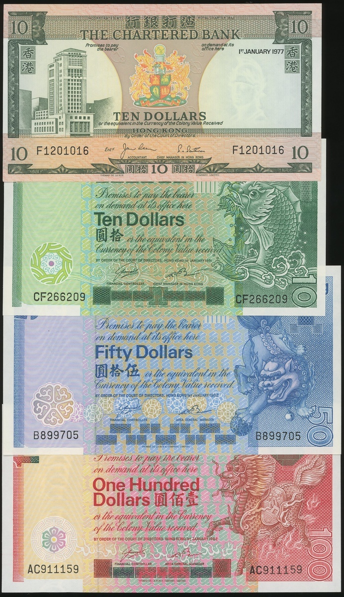 The Chartered Bank, lot of 4x notes consisting of $10 (2), $50 and $100, dated 1.1.1977, 1.1.1981, 1.1.1982 and 1.1.1982 respectively, serial numbers F1201016, CF266209, B899705, AC911159,