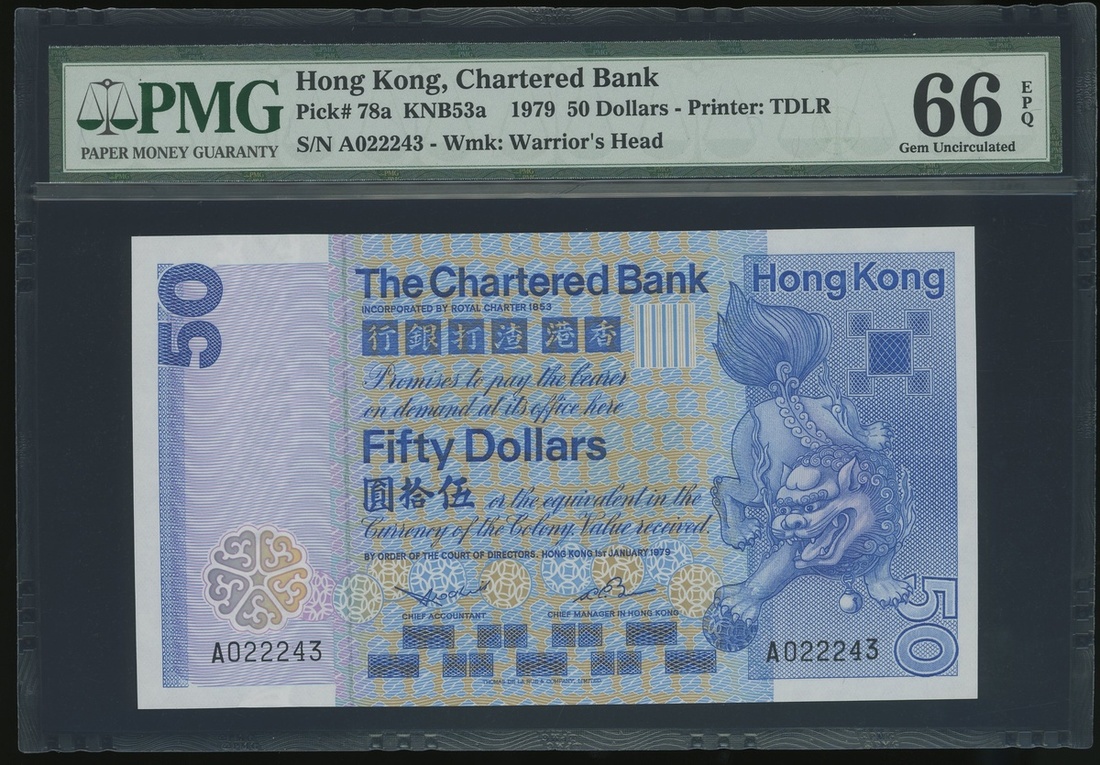 The Chartered Bank, $50, 1.1.1979, serial number A022243, (Pick 78a), PMG 66EPQ Gem Uncirculated