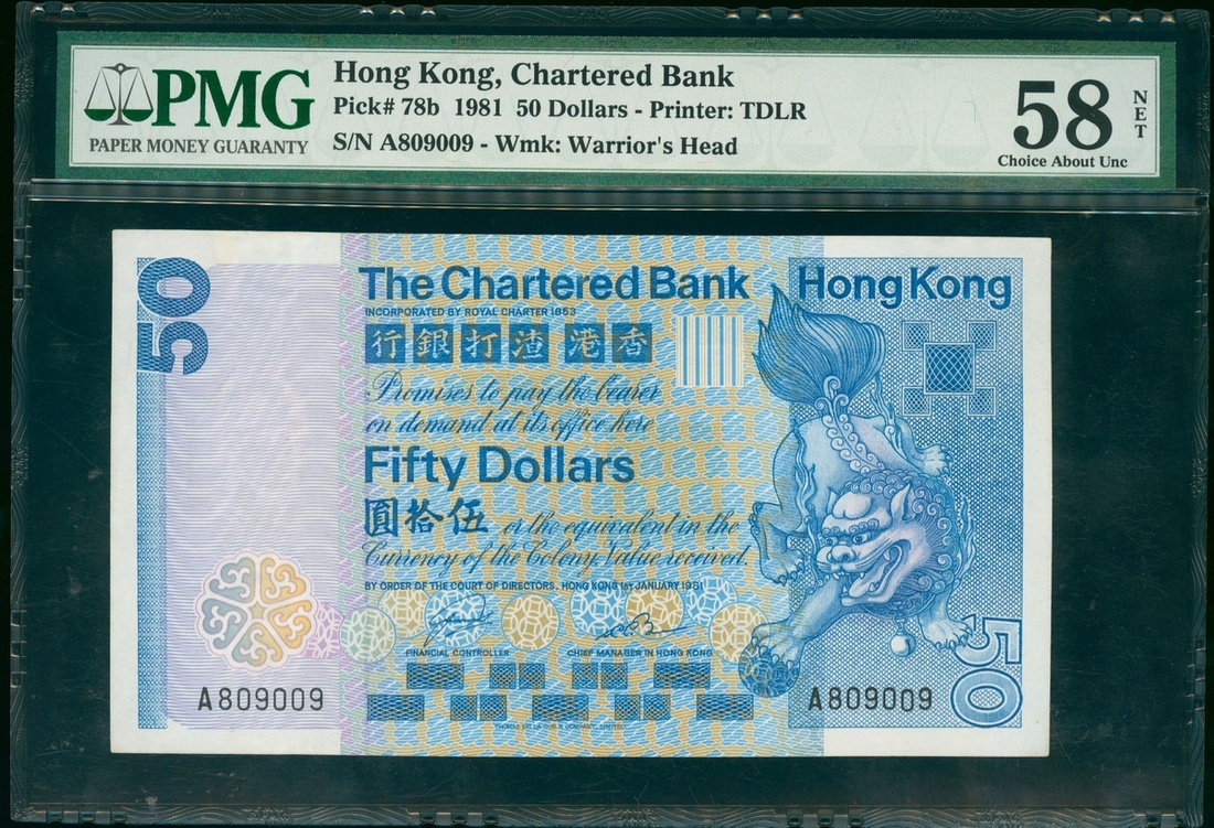 The Chartered Bank, $50, 1.1.1981, serial number A809009, (Pick 78b), PMG 58NET Choice About Uncirculated (Foreign Substance)