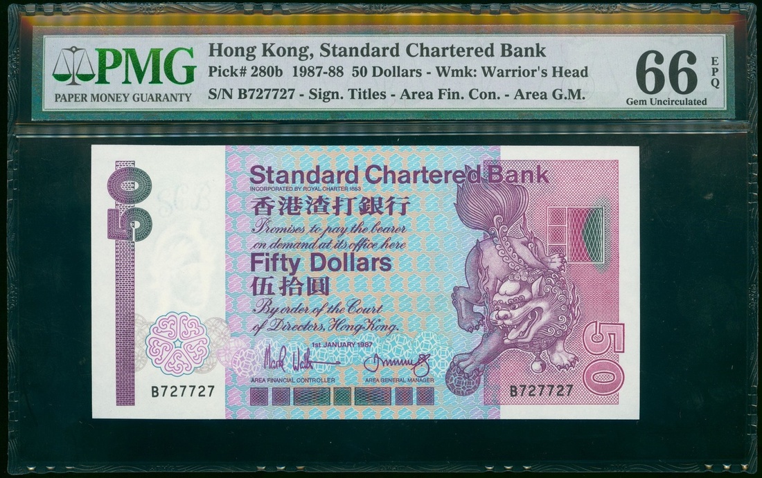 Standard Chartered Bank, $50, 1.1.1987, radar-repeater serial number B727727, (Pick 280b), PMG 66EPQ Gem Uncirculated