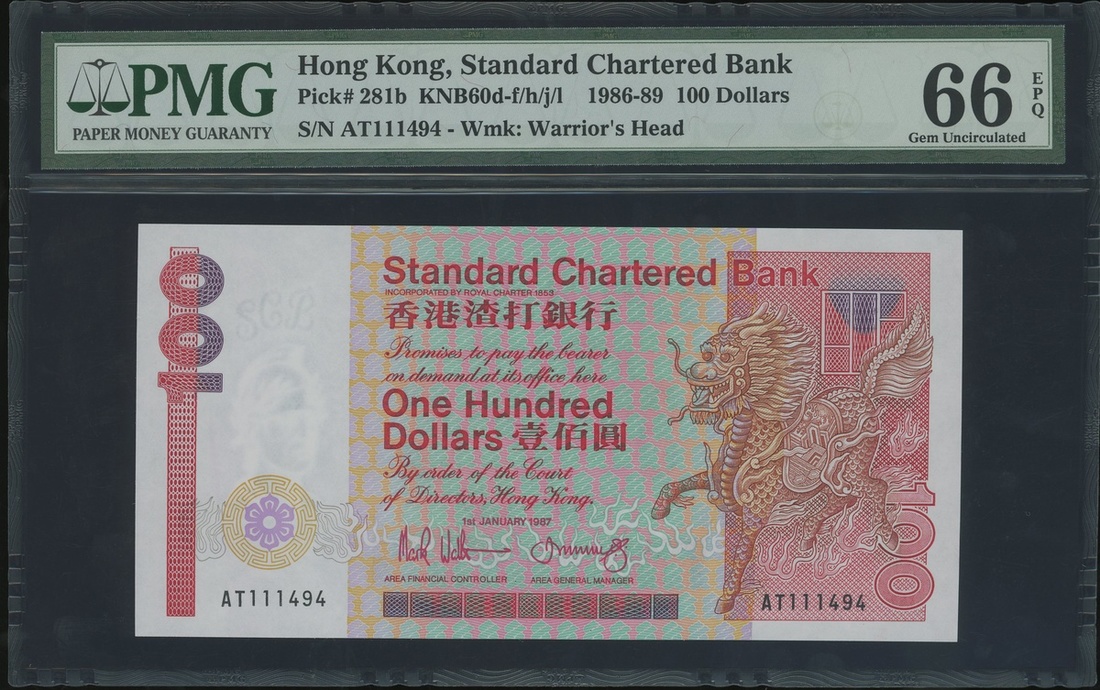 Standard Chartered Bank, $100, 1987, serial number AT111494, (Pick 281b), PMG 66EPQ.