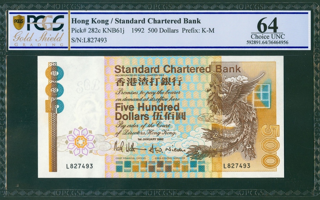 Standard Chartered Bank, $500, 1.1.1992, serial number L827493, (Pick 282c), PCGS Gold Shield Grading 64 Choice Uncirculated