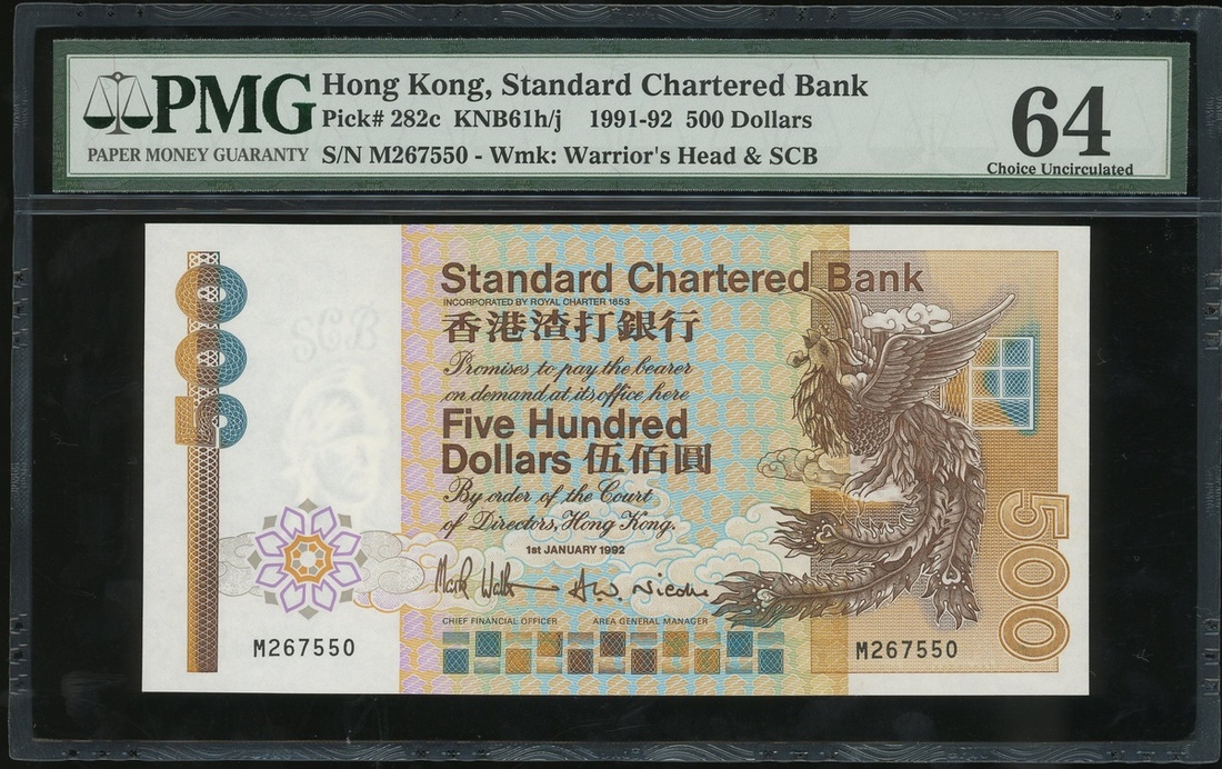 Standard Chartered Bank, $500, 1992, serial number M267550, (Pick 282c), PMG 64 choice uncirculated.