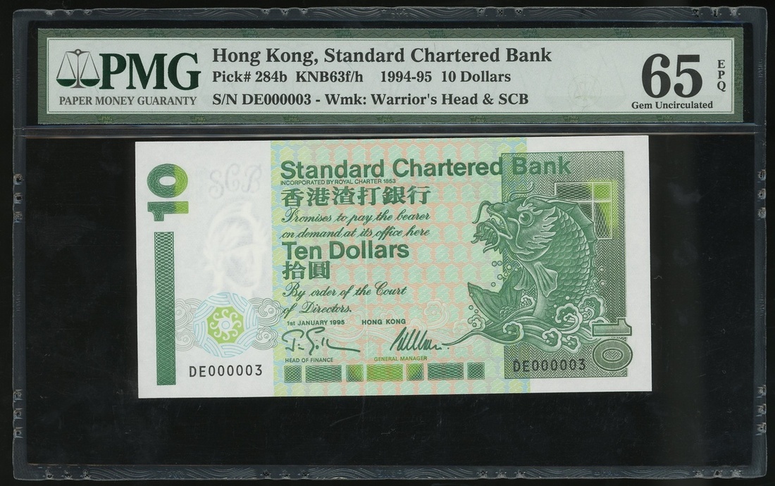 Standard Chartered Bank, $10, 1.1.1995, low serial number DE000003, (Pick 284b), PMG 65EPQ Gem Uncirculated
