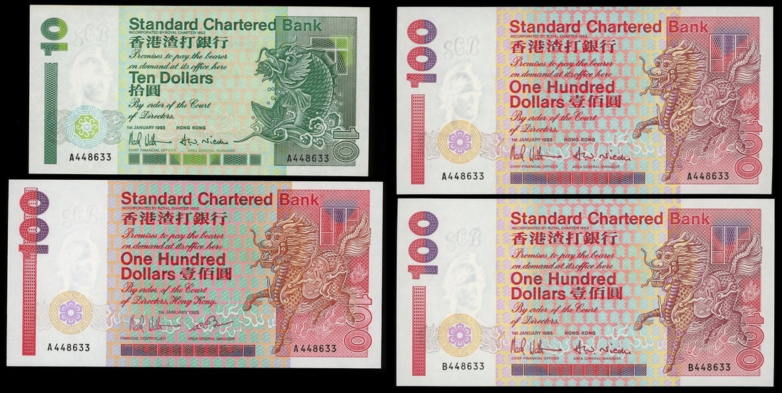 Standard Chartered Bank, lot of 4x notes consisting of $10, 1.1.1993, and $100 (3), the first note dated 1.1.1985, the second and third 1.1.1993, serial prefix A, A, A and B with identical number 448633,