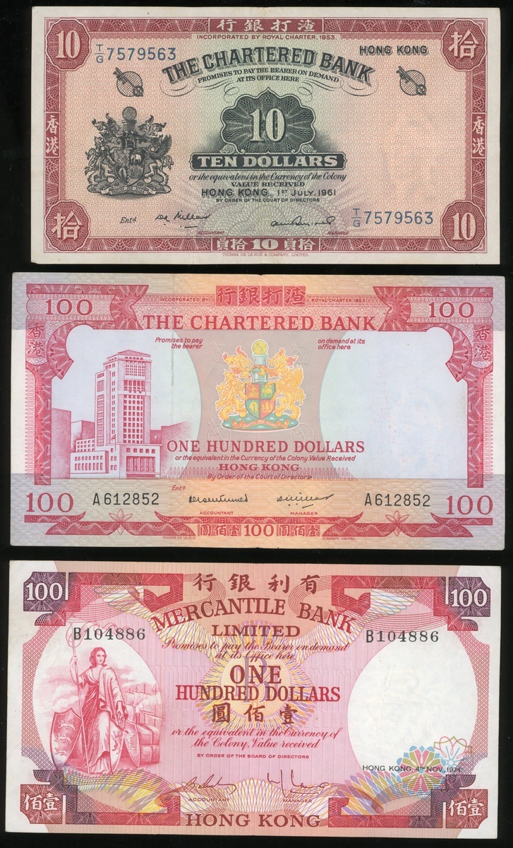 The Chartered Bank, a pair of $10, 1.7.1961 and $100, ND (1970-1975), serial numbers T/G 7579563 and A612852, also Mercantile Bank Limited $100 , 4.11.1974, serial number B104886,