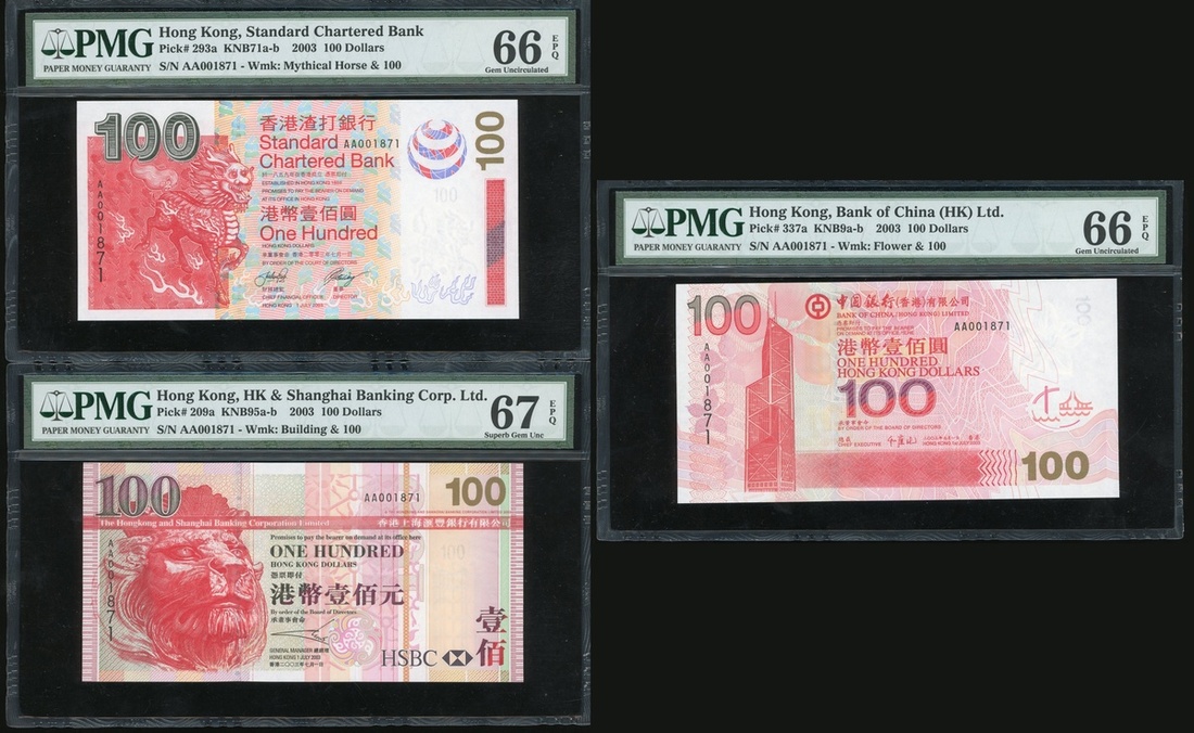 Hong Kong, group of 3x $100 from the three different banks, all with the same serial number AA001871,