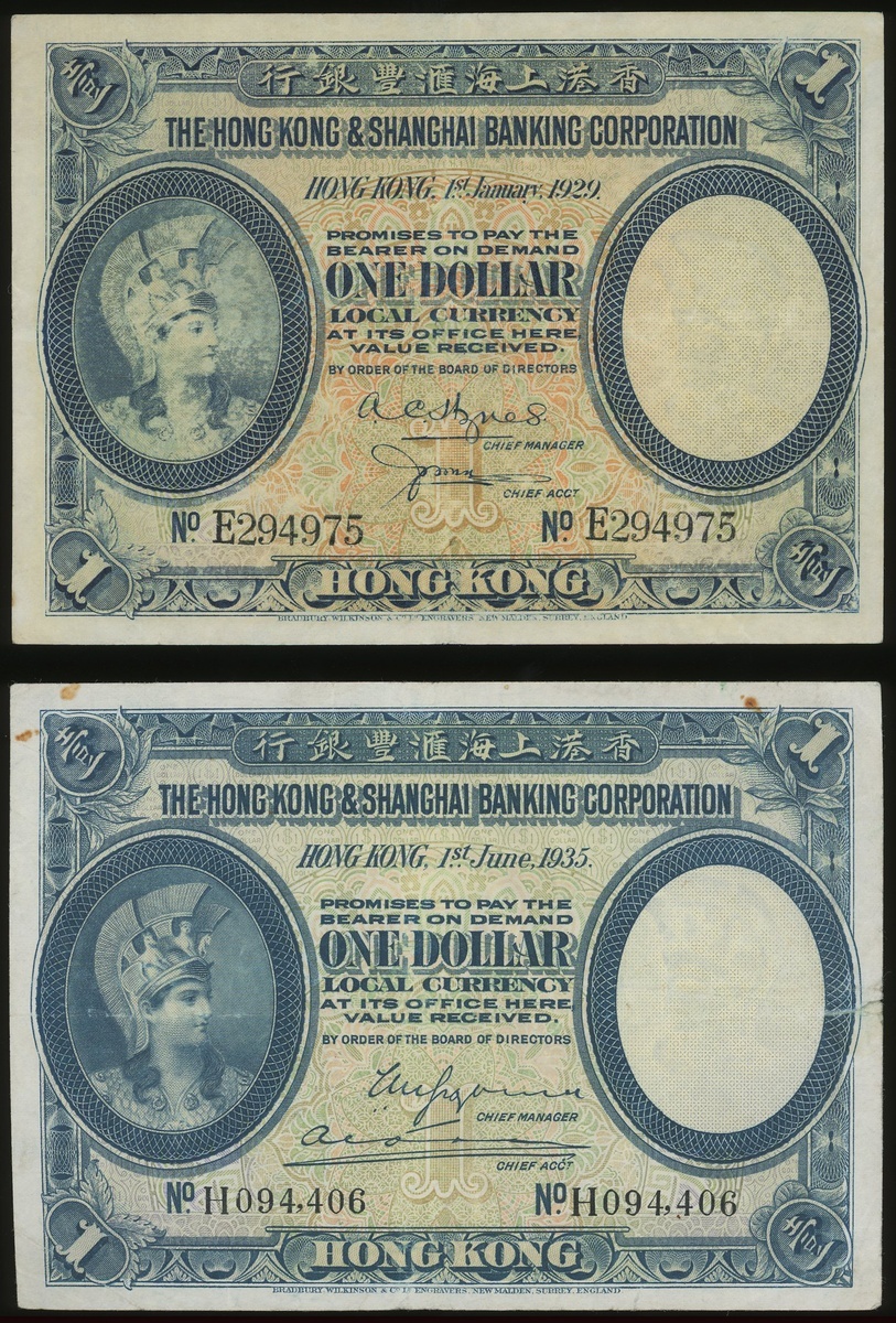 The Hongkong and Shanghai Banking Corporation, a pair of $1, 1.1.1929 and 1.6.1935, serial numbers E294975 and H094406, (Pick 172b, 172c), pressed, especially the 1929 which has loss of colour on the obverse. Overall about very fine (2)