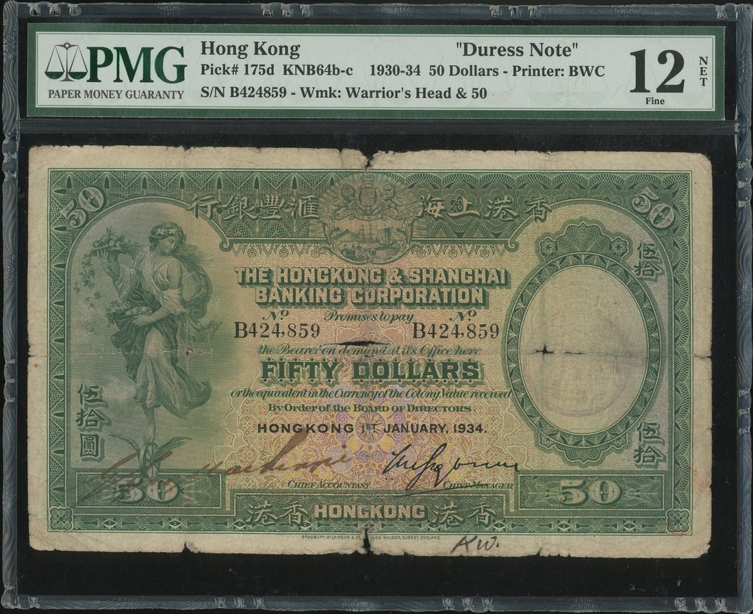 The HongKong and Shanghai Banking Corporation, $50, 1.10.1934, DURESS, serial number B424859, (Pick 175d), PMG 12NET Fine (Edge and Internal Damage, Annotations, Stamp Ink)