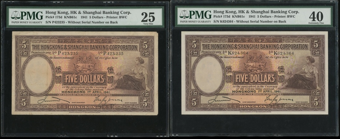 The HongKong and Shanghai Banking Corporation, lot of 2x $5, both dated 1.4.1941, serial numbers P423235 and K624364, (Pick 173d), graded PMG 25 and 40 respectively (2)