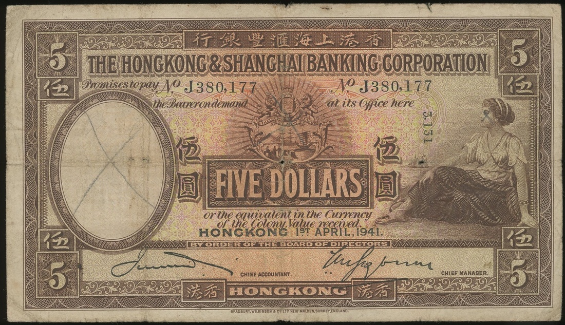 The Hongkong and Shanghai Banking Corporation, $5, 1.4.1941, DURESS ISSUE, serial number J380177, additional vertical number 3131, (Pick 173c), very good, holes on cross folds