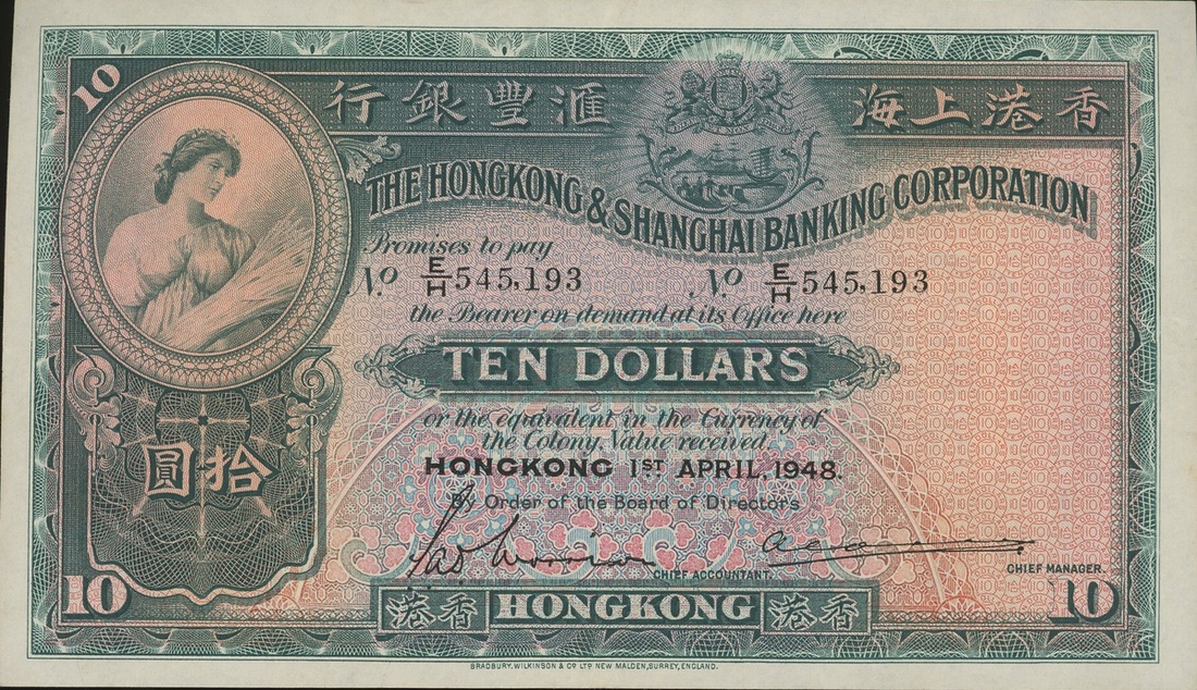 The HongKong and Shanghai Banking Corporation, $10, 1.4.1948, serial number E/H 545193, (Pick 178d), extremely fine