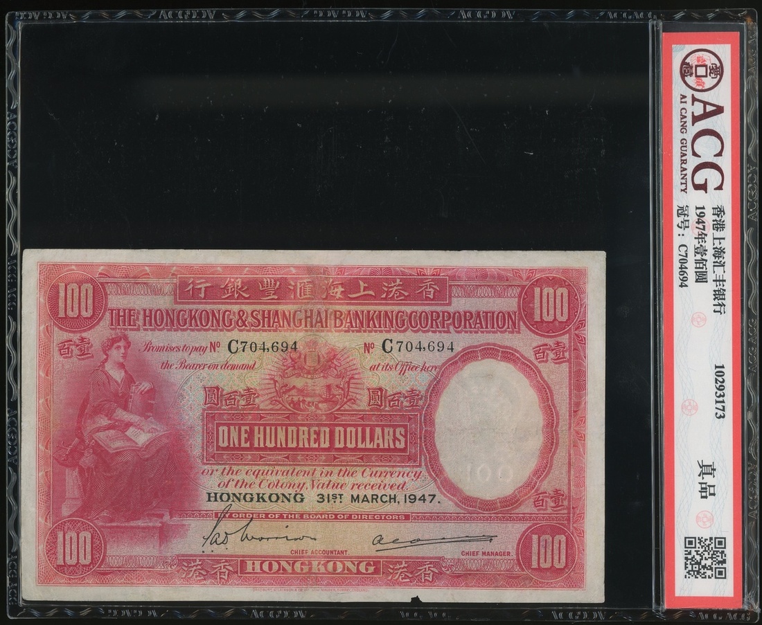 The Hongkong and Shanghai Corporation, $100, 31.3.1947, serial number C704694, (Pick 176e), in ACG slab but overall repaired very good