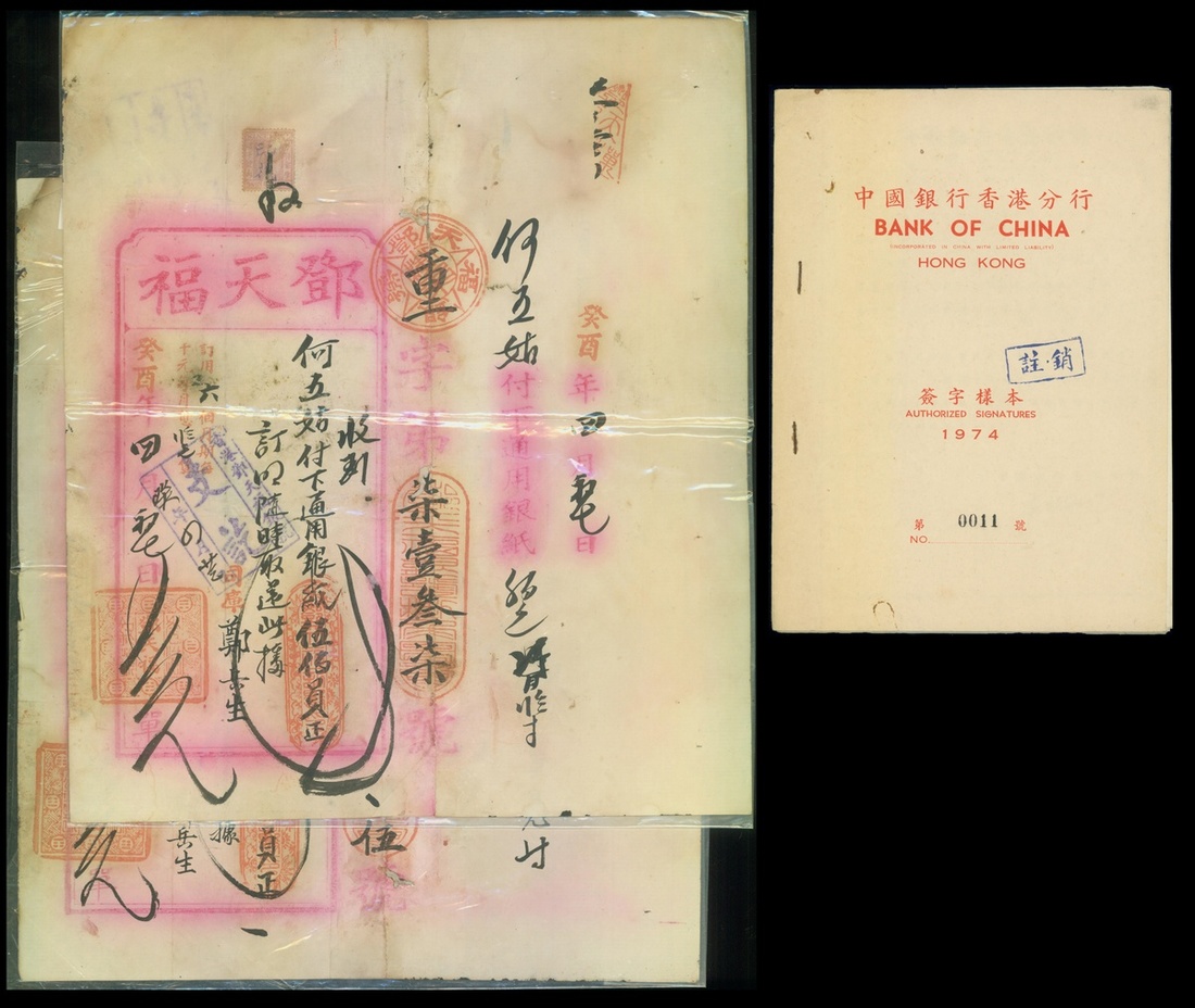 Tang Tin Fuk Bank, Hong Kong, a lot of 5x deposit receipts, $500 (2), $600 and $2000 (2), 1933, also Bank of China (Hong Kong) sample booklet of authorised signatures, 1974,
