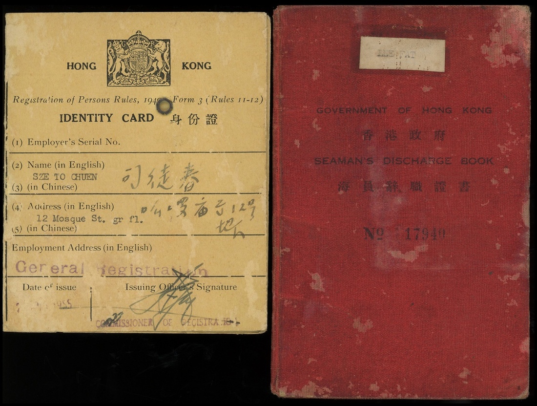 Hong Kong, a Hong Kong ID card issued in 1955, as well as a Seaman's Discharge Book, number 17940, with records of cargo voyages between 1952-1961 primarily to and fro Hong Kong and Tai Chung Shan well preserved, rare