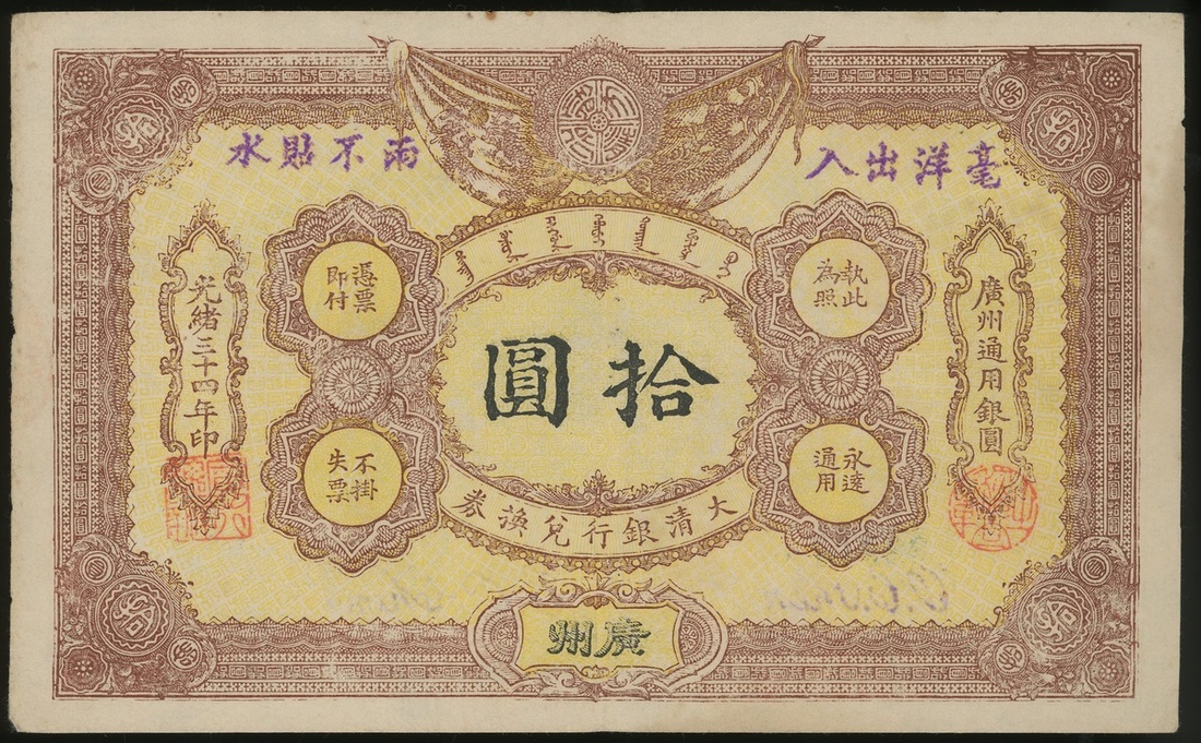 The Ta-Ching Government Bank, $10, Canton, CONTEMPORARY COUNTERFEIT, Guangxu year 34 (1908), serial number 32925, (Pick A71C), pressed very fine