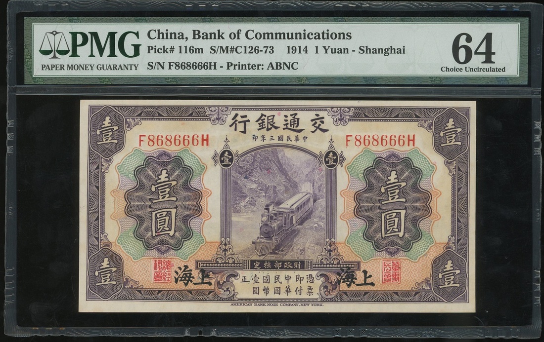 Bank of Communications, 1 yuan, 1914, Shanghai, serial number F868666H, purple on multicolour underprint, steam train at centre,