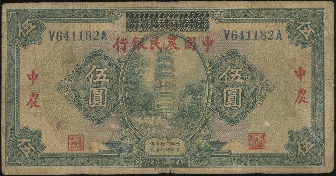 Farmers Bank of China, 5 Yuan overprint on Hupeh Provincial Bank, 1929 (1940), serial number V641182A, (Pick 467d), about fine, small centre hole