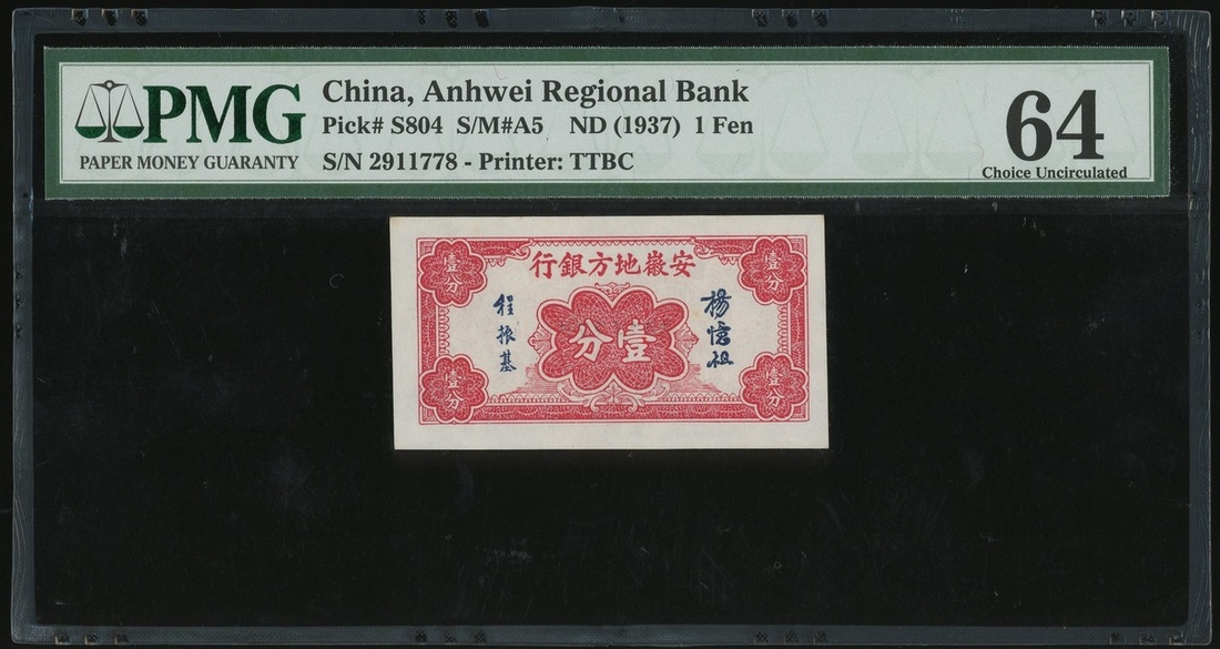 Anhwei Regional Bank, 1 fen, ND (1937), serial number 2911778, (Pick S804), PMG 64 Choice Uncirculated