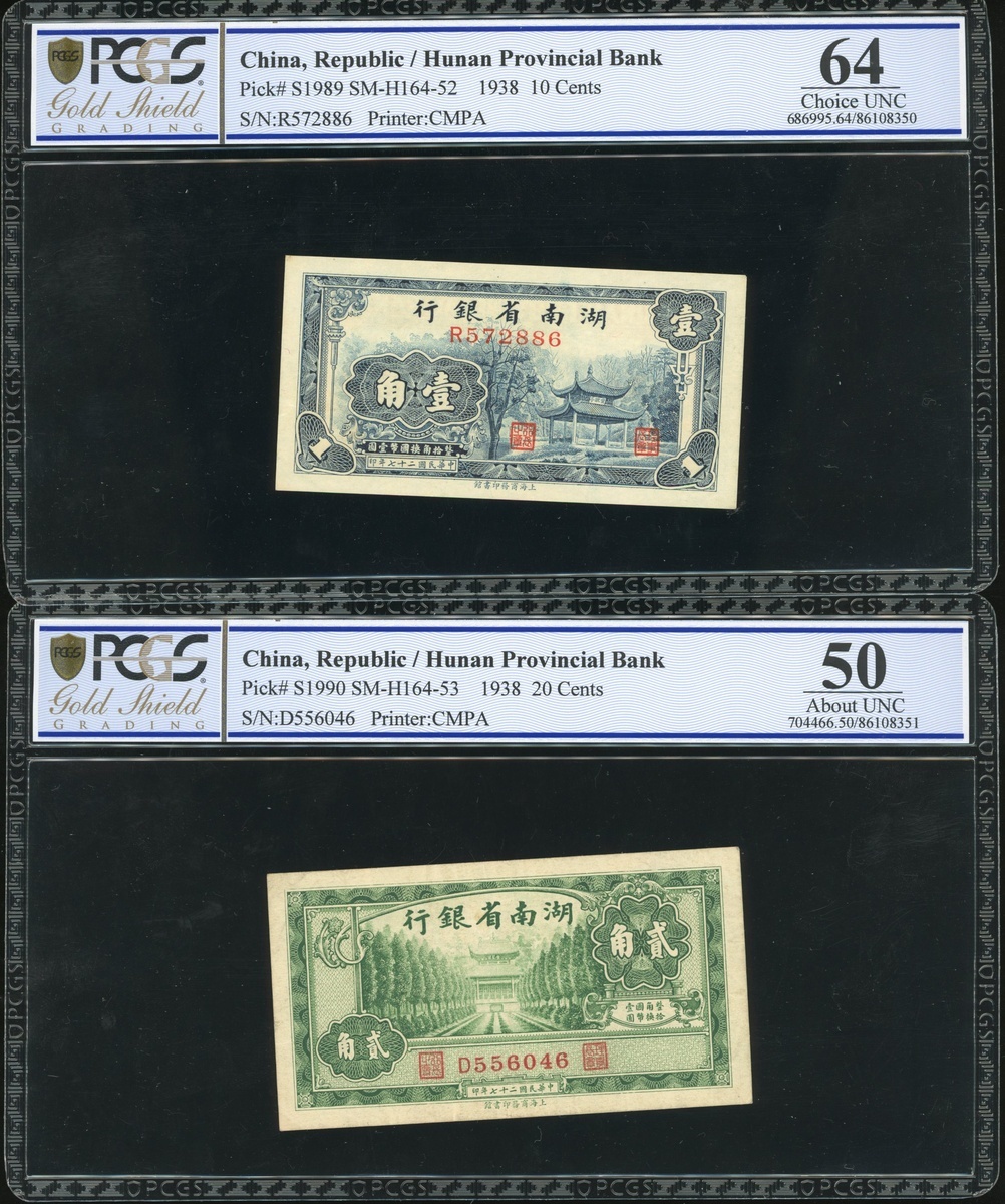 Hunan Provincial Bank, 10 and 20 cents, 1938, serial number R572886 and D556046, (Pick S1989, S1990), PCGS Gold Shield 64 Choice Uncirculated and 50 About Uncirculated (2)
