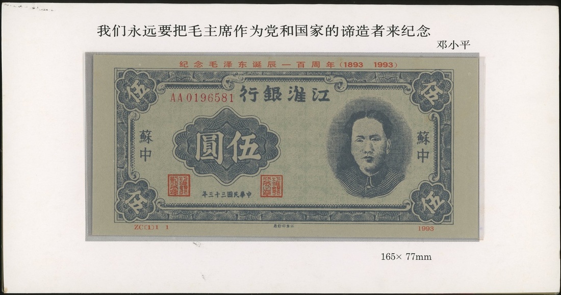 Kiang Hwai Bank of China, 5 yuan, fascimile copy issued in 1993 to commemorate the 100th Anniversary of Mao Zedong, uncirculated, enclosed in an offical cardboard folder