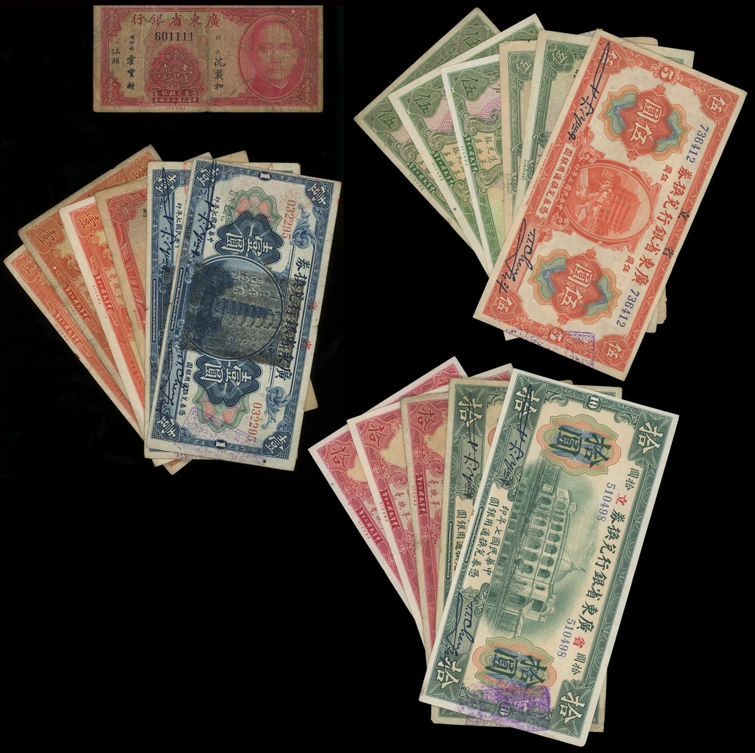 Kwangtung Provincial Bank, group of 17x notes consisting of 10 cents, 1 Yuan (5), 5 Yuan (6) and 10 Yuan (5), 1918-1936, some undated, (Pick various), mixed condition, in general about very fine, viewing recommended, sold as seen no returns (17)