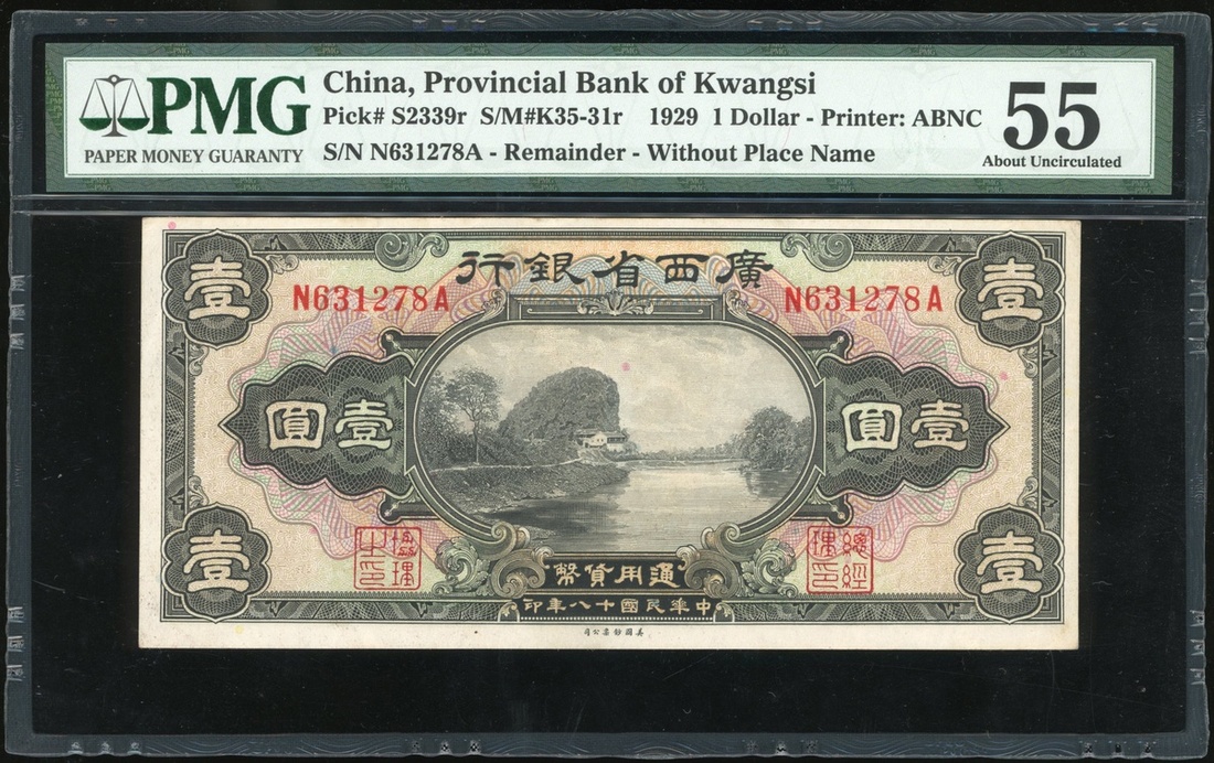 Provincial Bank of Kwangsi, $1, 1929, serial number N631278A, remainder, without place name, (Pick S2339r), PMG 55 about uncirculated.