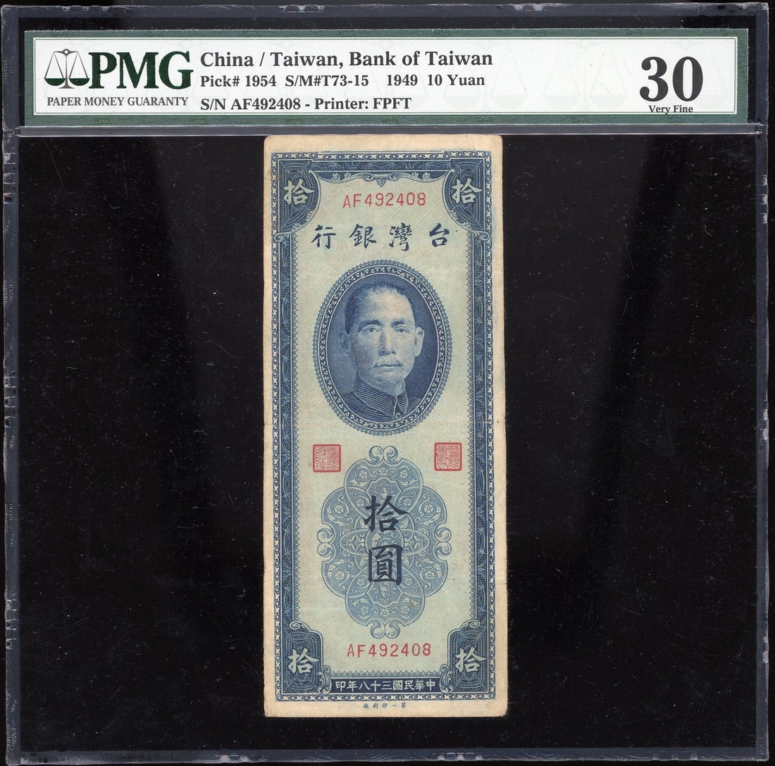 Bank of Taiwan, 10 yuan, 1949, serial number AF492408, vertical format, blue, Sun Yat Sen at top centre,