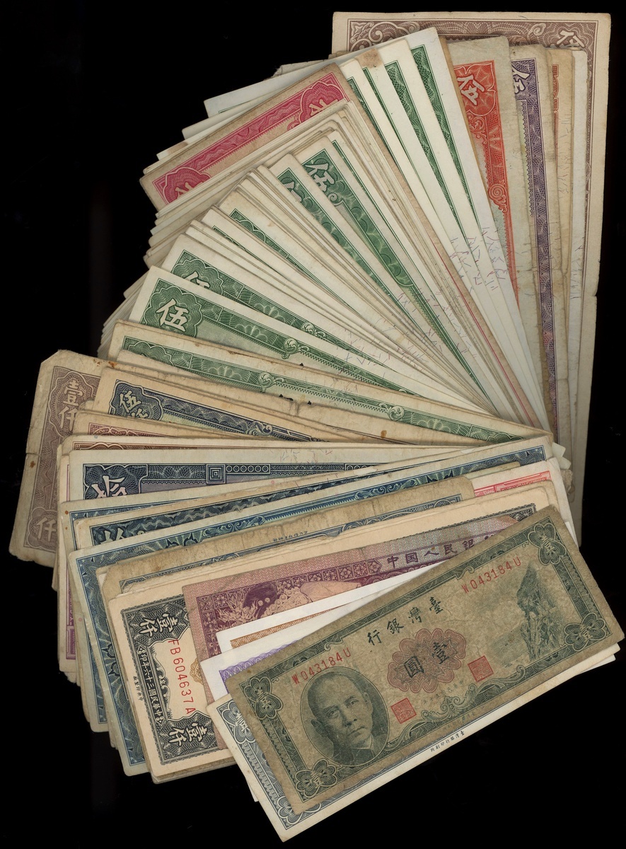 China Mixed Lot, a large group of approximately 180x notes primarily consisting of notes issued during the Republican period, including: The Central Bank of China, approximately 148x notes with denominations ranging between 10 cents and 10,000 Yuan, including Gold Customs Unit 1000 Yuan and 5000 Yuan (2); Bank of China, 1 Yuan to 10 Yuan (approximately 22) with some brief consecutive serial notes, 1931-1940; Bank of Communications 5 and 10 Yuan, 1935 and 1914; The Central Resreve Bank of China 500 Yuan, 1943; The Farmers Bank of China 10 Yuan (3), 1935; Bank of Taiwan 1 Yuan (2), 1961; People's Bank of China, 4th series renminbi, 1980, 5 Jiao; also Bank of China Foreign Exchange Certificates 10 cents (2) and 50 cents, 1979,