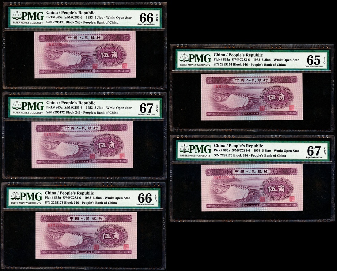 People's Bank of China, 2nd series renminbi, 1953, 5 chiao, consecutive serial number II IV VI 2295171-175,