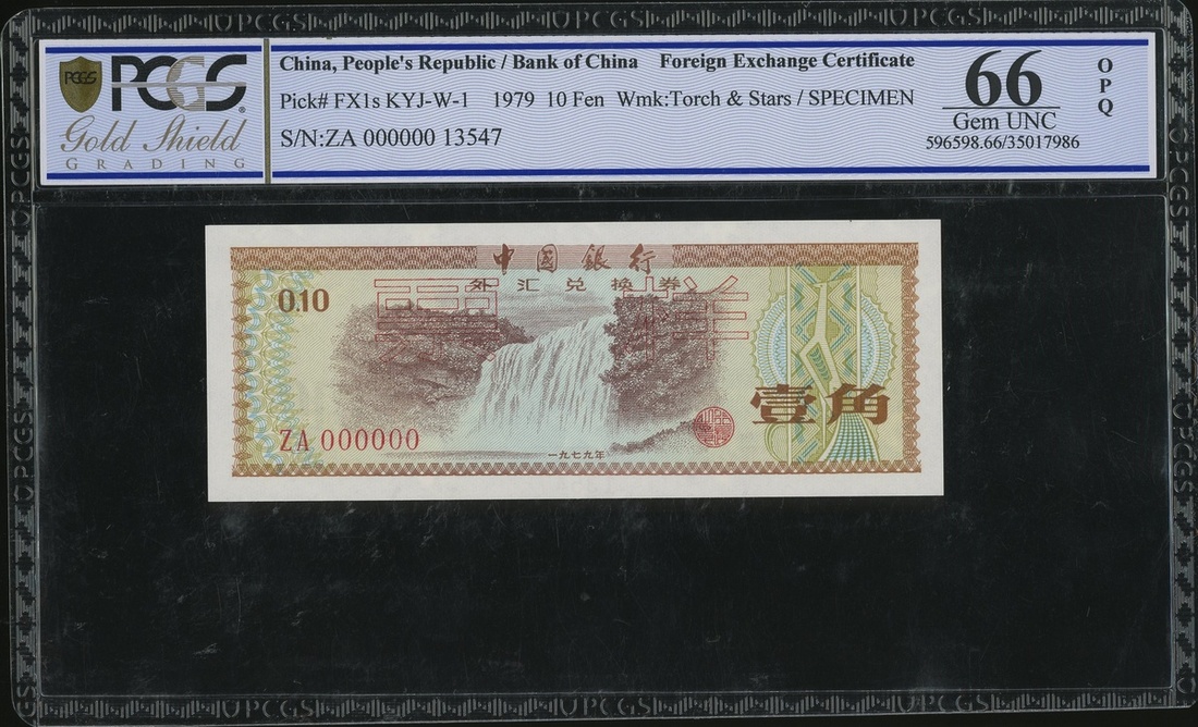 Bank of China, 10 Fen foreign exchange certificate specimen, 1979, control number 13547, (Pick FX1s), PCGS Gold Shield 66OPQ Gem Uncirculated