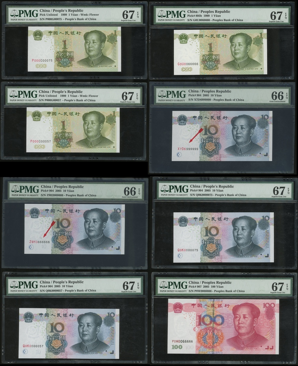 (Pick 895b, unlisted, 904, 907), all PMG graded, 2 x10 yuan 66EPQ, the rest 67EPQ.(8)
