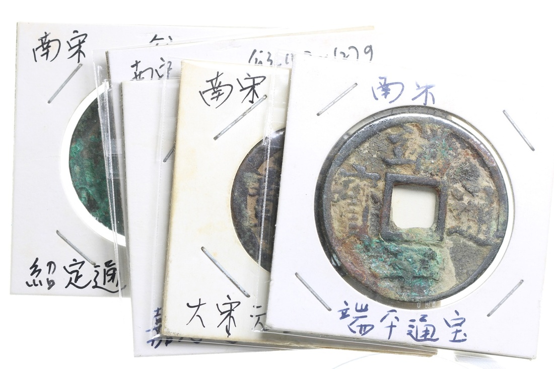 Southern Song Dynasty, a group of 5x cash coins, including 2x 'Shao Ding Tong Bao', 'Jia Ding Tong Bao', 'Duan Ping Tong Bao' and 'Da Song Tong Bao', with paper clip, patinated, fine to very fine (5)