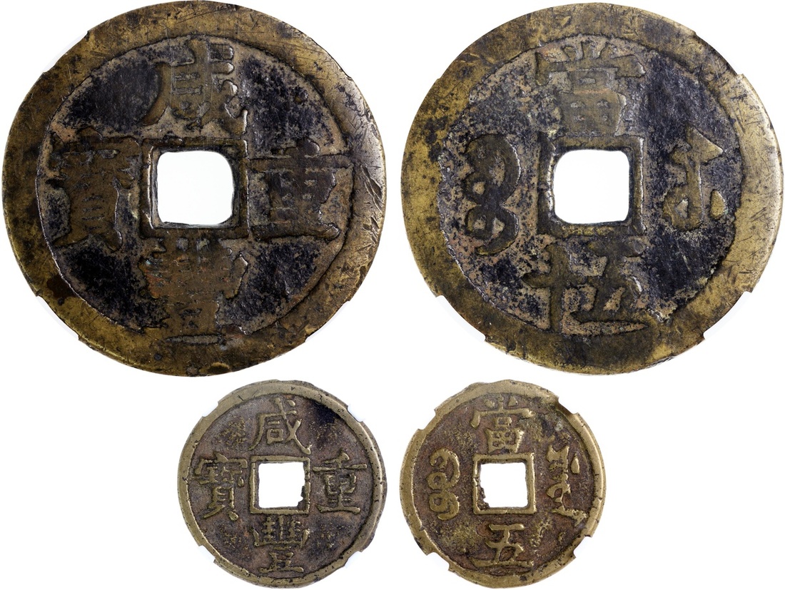 Qing Dynasty, a pair of 5 and 50 cash, 'Xian Feng Zhong Bao', Bao Yuan and Bao Soo Mint, the 5 cash is 28.5*1.8mm and weighs 5.7g, the 50 cash is 51.4*3.6mm and weighs 46.3g,