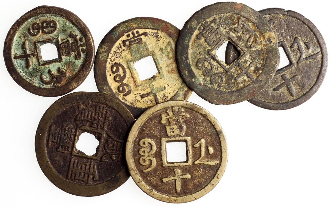 Qing Dynasty, group of 6x 10 cash, Xian Feng Zhong Bao (4), Tongzhi Zhong Bao (2)