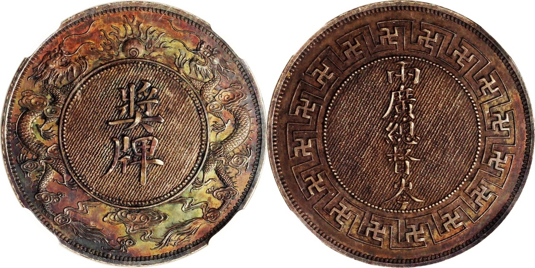 Medal of Governor Cen Chun Xuan of Kwangtung and Kwangsi, struck in silver, 1903-1906, in NPGS holder Genuine, dark toned, about uncirculated and very rare.