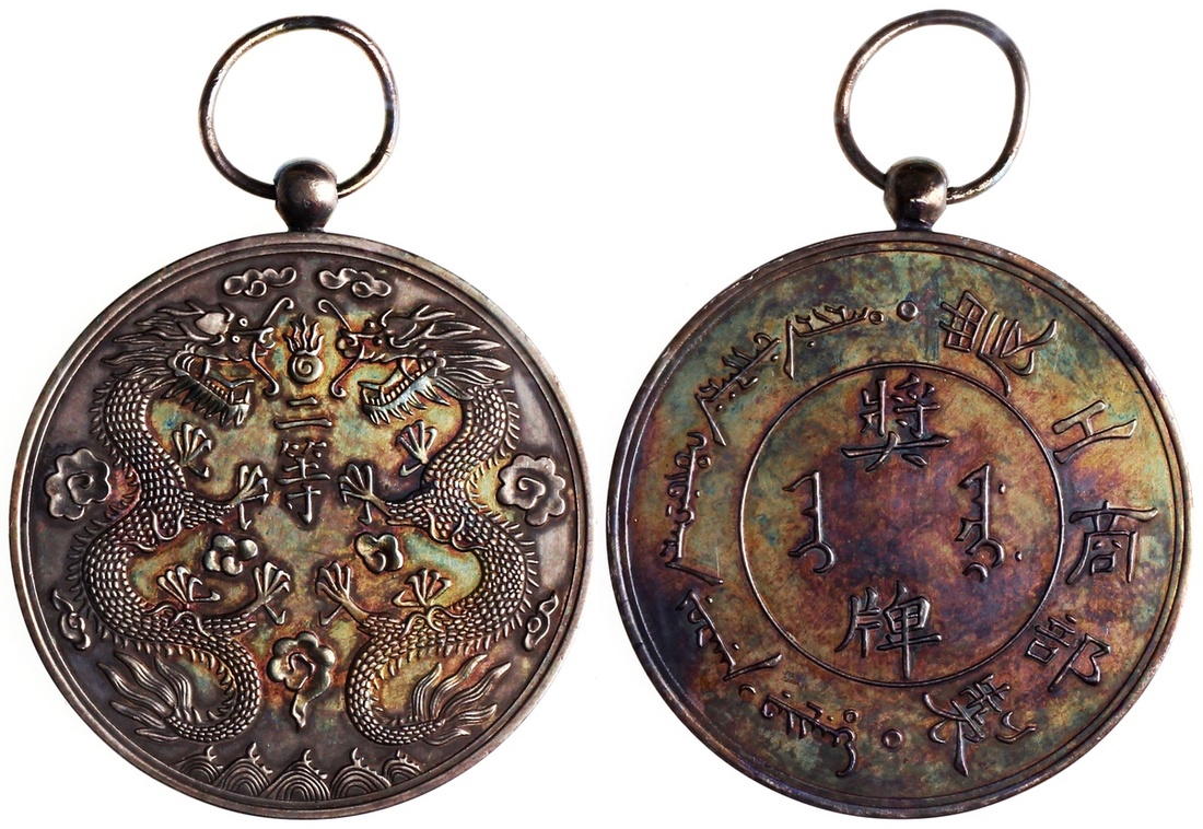 Late Qing Dynasty, 2nd Class Merit Medal of the Bureau of Agriculture, Industry and Commerce, struck in silver, 1903-1911, facing dragons on obverse, Manchu and Chinese characters on reverse,