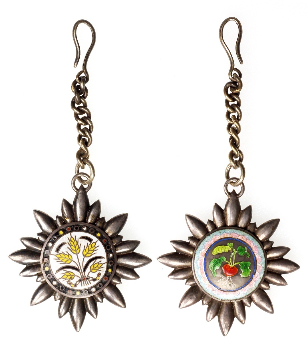 The Order of Golden Grain, 9th Class, special miniature type, silver and enamel, golden grain at centre on obverse as usual, reverse with red radish and leaves instead of Chinese characters, rare seen,