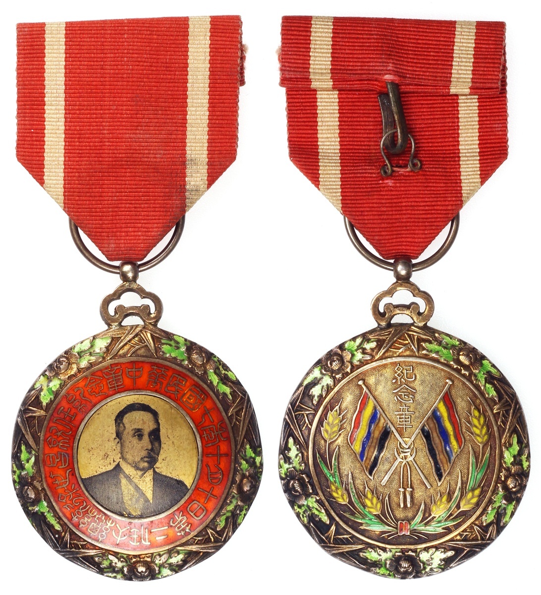 Commemorative Medal for the 2nd President Inauguration, gilt silver enameled, 1918, potrait of President Xu Shichang at centre on obverse, crossed flags on reverse, some minor stains, with ribbon, good very fine and very rare.