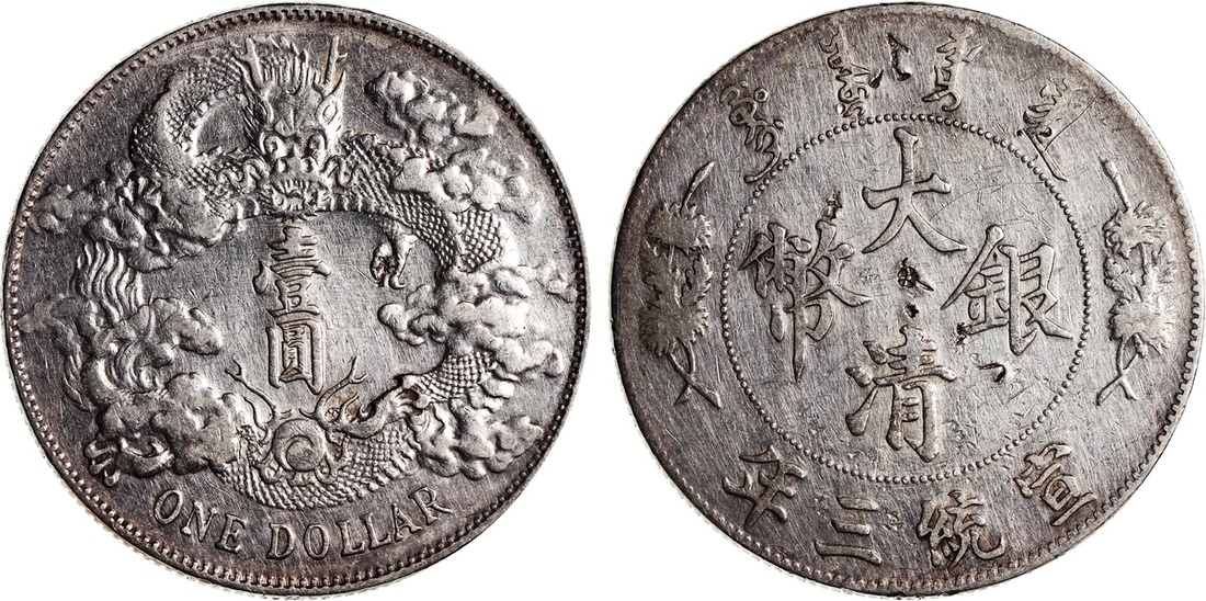 Qing Dynasty, silver $1, Year 3 of Xuantong, chopmark, cleaned, VF
