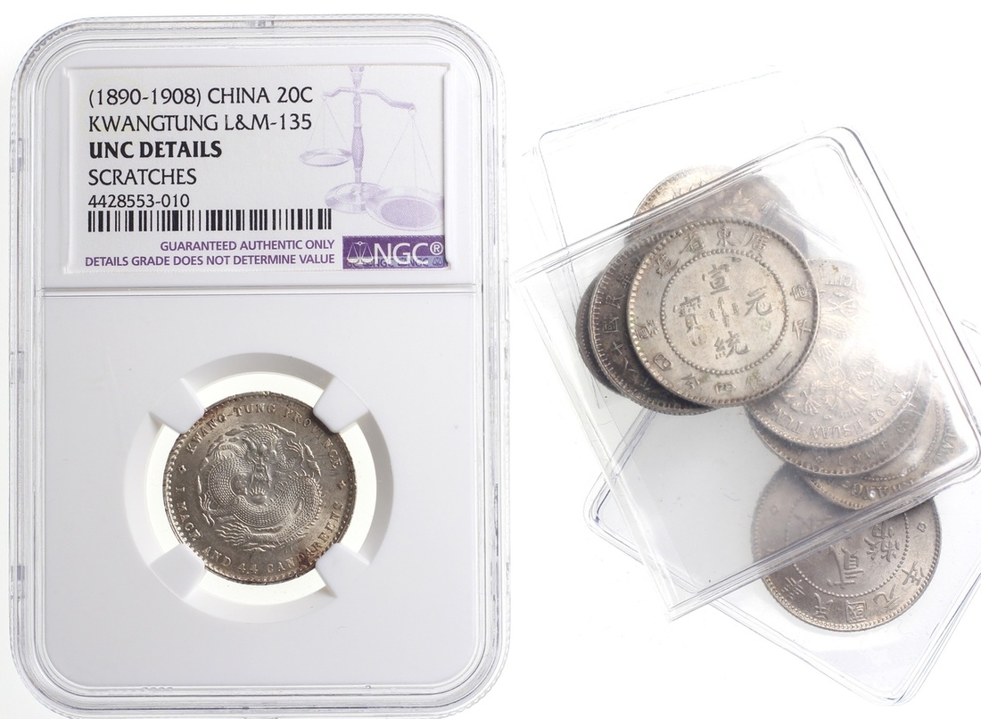 a Guangxu era Kwangtung 20 cents graded NGC UNC Details (Scratches) and the other mixed condition (9)