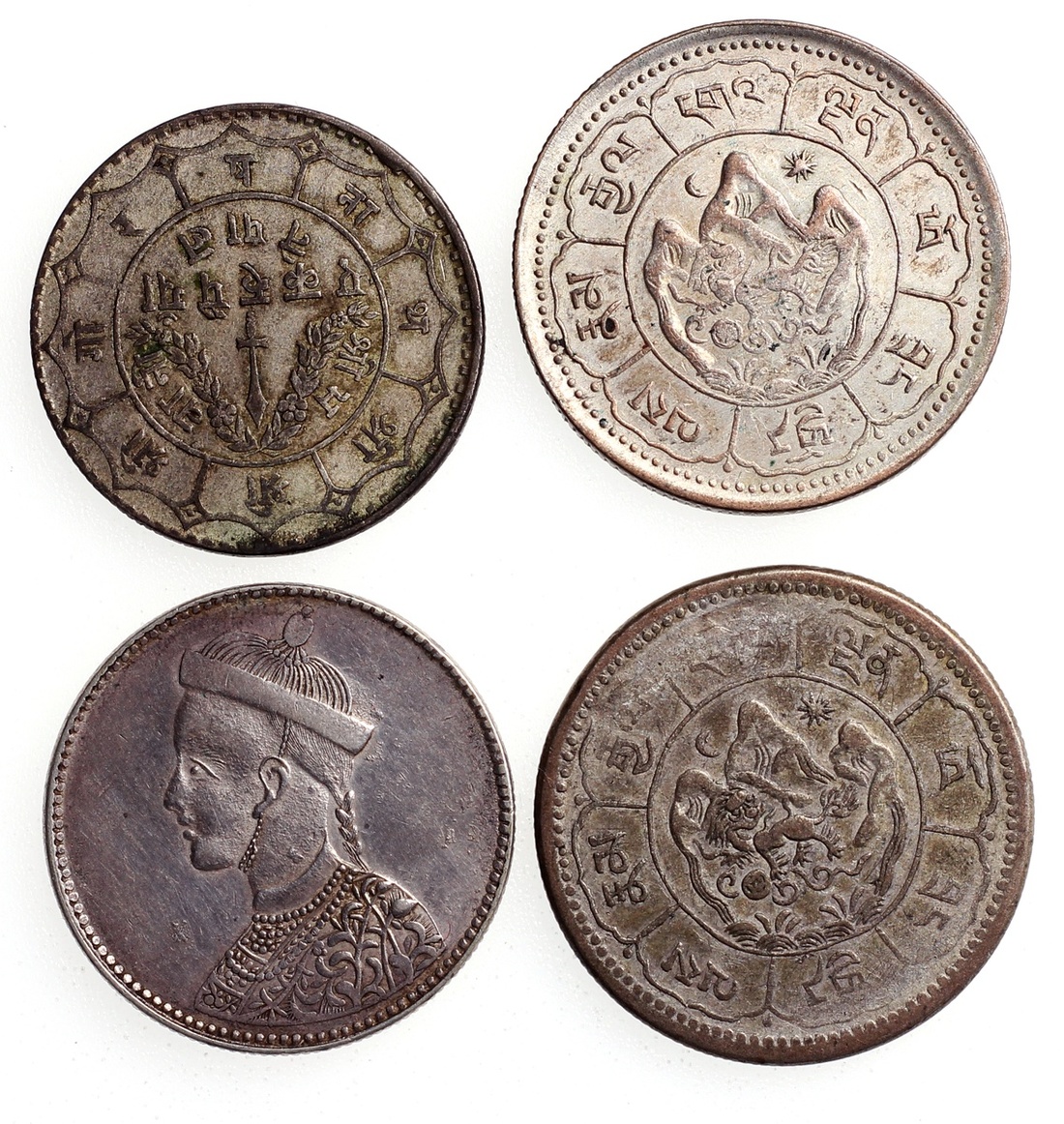 Tibet, group of 4 silver coins, 1.5 srang (1), 3 srang (3) and 1 rupee, vertical rossette,