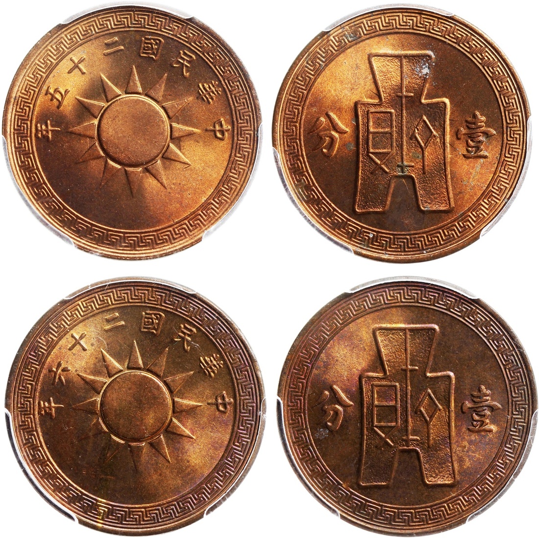 China, Republic, a pair of 1 cents, 1936 and 1937, (Y-347, CL-MG.72 and Y-347), graded PCGS MS64RD and MS65RB (2)