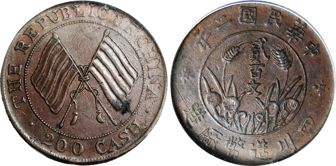 Szechuan Province, bronze 200 cash, 1913, crossed flags on obverse,