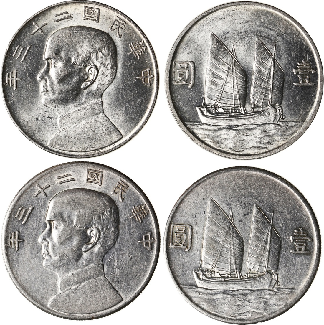 China, Republic, a pair of silver $1, 1934, Junk dollar, one with original luster, AU to UNC.(2)