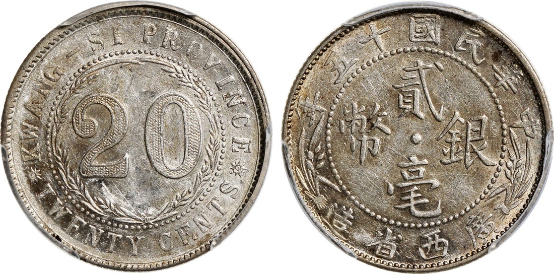 Kwangsi Province, silver 20 cents, 1926, MINT ERROR, reverse lamination, PCGS AU53