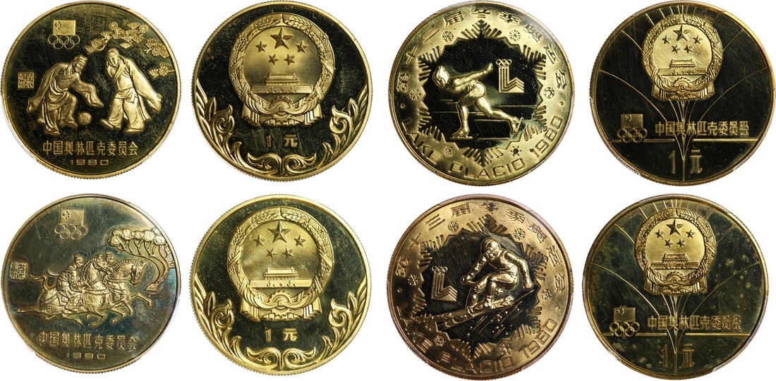 People's Republic of China, complete set of 4 brass 1 yuan issued to commemorate the 1980 Lake Placid Olympics, each featuring a sport: 'Equestrian', 'Alpine Skiing', 'Speed Skating' and 'Soccer',