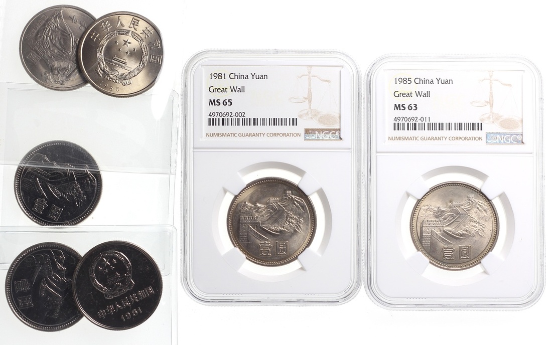 China, a lot of 7 x nickel 1 yuan, including 4 x1981 and a 1985 'Great Wall' dollar and 2 x1986 'International Year of Peace', all mint state,2 Great Wall dollars graded by NGC MS 63 and 65.(7) Sold as is, no return