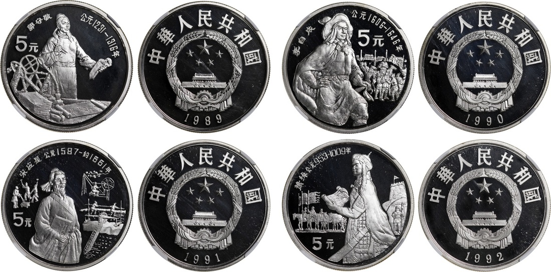 People's Republic of China, Historical Figures Series VI-IX, 5 Yuan silver proof coins, 1989-1992, 'Guo Shoujing', 'Li Zicheng', 'Song Yingxing' and 'Xiao Chuo',